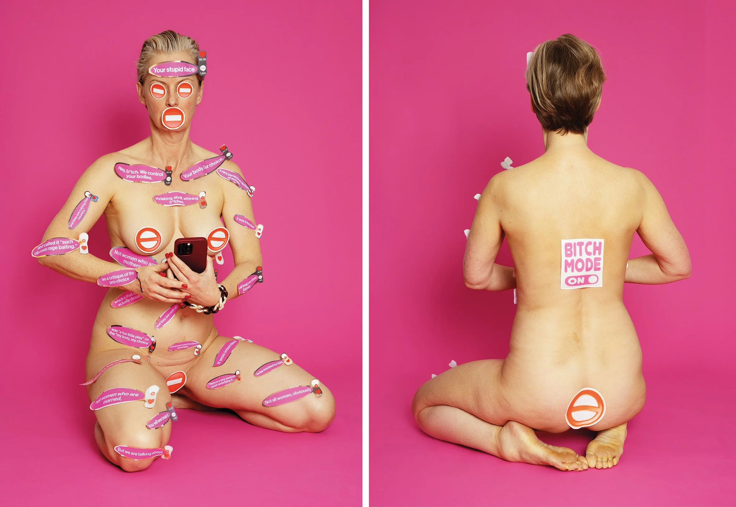 I have been working on how we communicate and the personas we assume on social media. I use emoticons and excerpts from pornographic sexting text messages, which I print out and then stick on my body, transferring them from the digital to the analog. They represent individual statements or, when combined, form entire sentences and commands. At the same time, the real body becomes a mere figure and projection surface, and the claimed maximum intimacy turns into unbridgeable strangeness and interchangeability, culminating in the expression of an almost shattering forlornness.