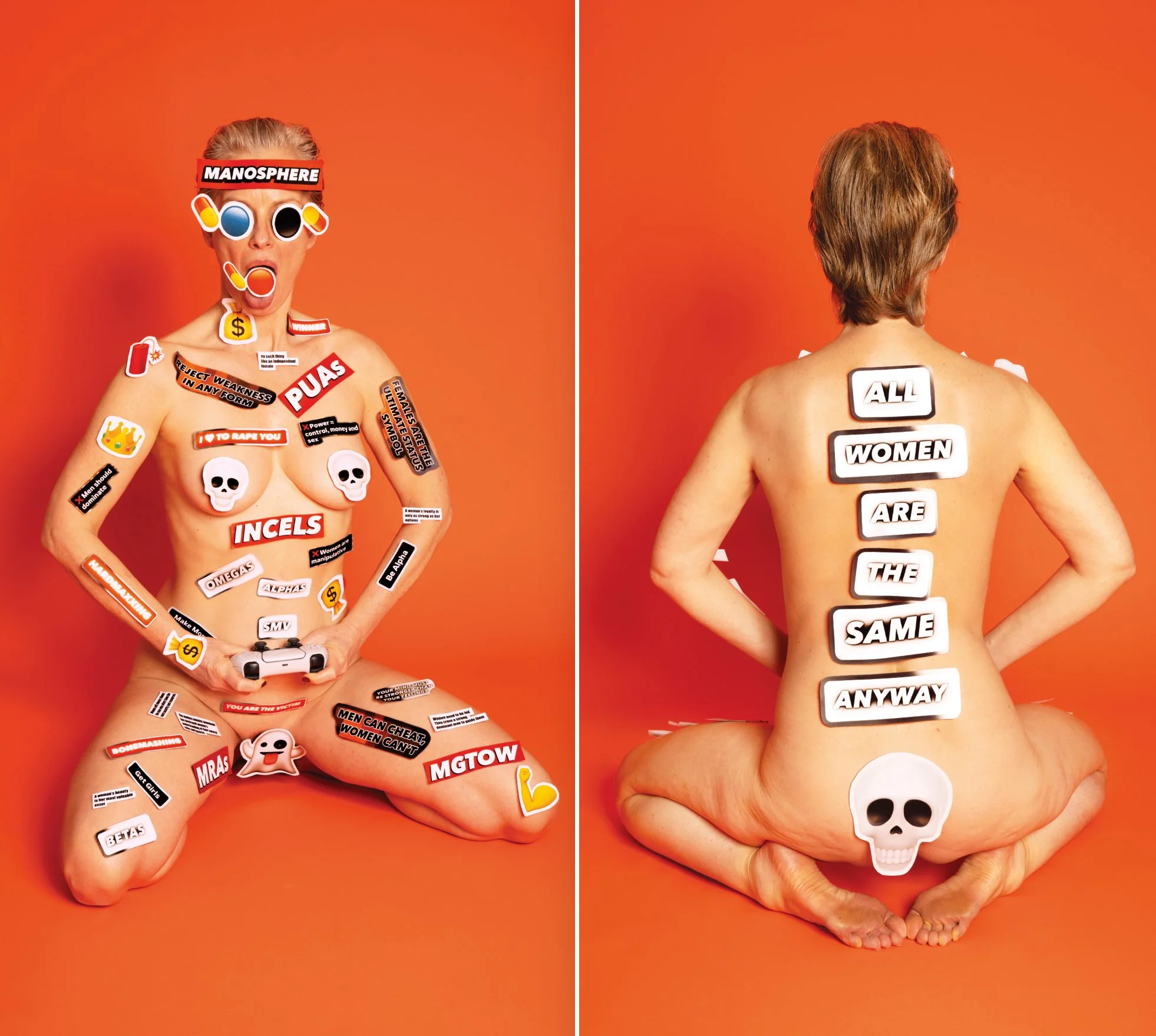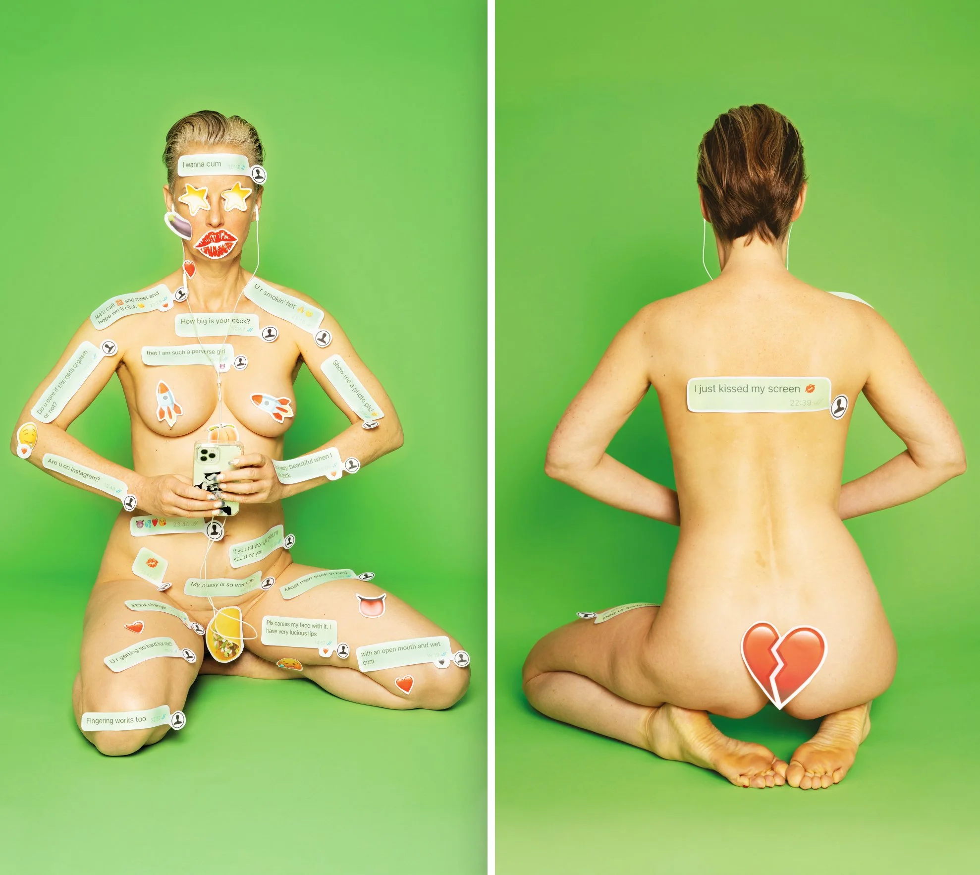 In my latest works from the long running series “Figure for the Base of a Crucifixion”, I delve into digital communication on social media, the representation of women, and contemporary issues with sexuality. I use emojis and excerpts from sexting text messages, TikTok videos, and REELS, as well as quotes from influencers, which I print out and then stick onto my body to transfer them from the digital to the physical realm. My body acts as a projection surface for practices from the virtual world and makes pervasive language visible. This deliberately deepens the contrast between the colorful emojis, intrusive texts, and the female body, which is nothing more than an advertising space.