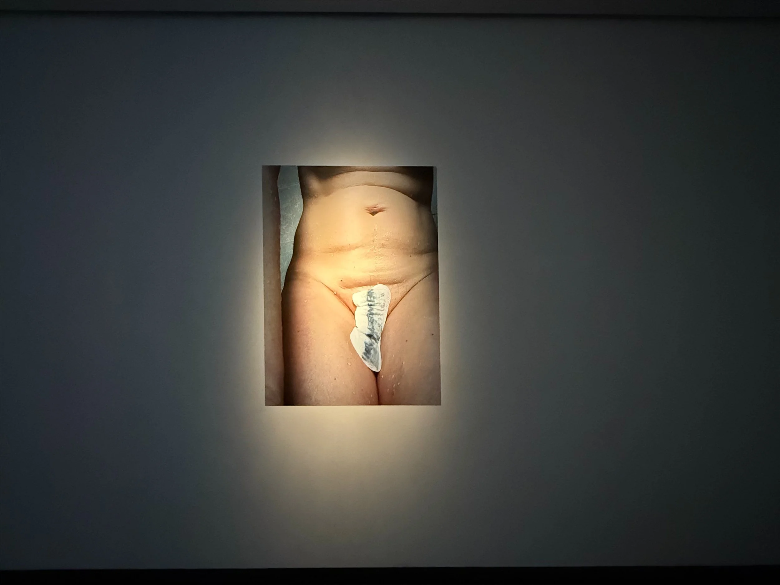 Damenbinde (I Like Beer), Readymade, 2025, marker on sanitary pad, 47 x 32 cm (framed)